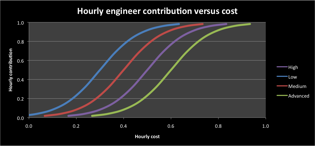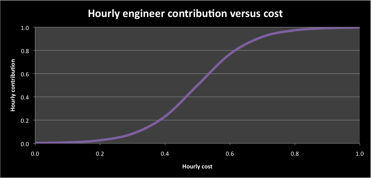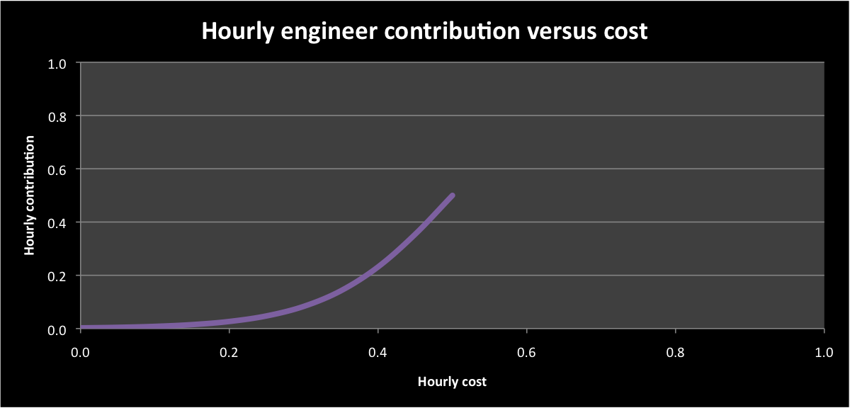 Now it doesn’t really matter what parameter we’re using for “contribution”. It’s just some overall measure of “rate of effective output”. I say “effective” because we all know that something as crude as, for example, “lines of code” is rarely, on its own, a useful measure in software. But despite the difficulty in putting a precise number on it, effectiveness is a real thing, it varies from person to person, and, all else being equal, it increases with time served.